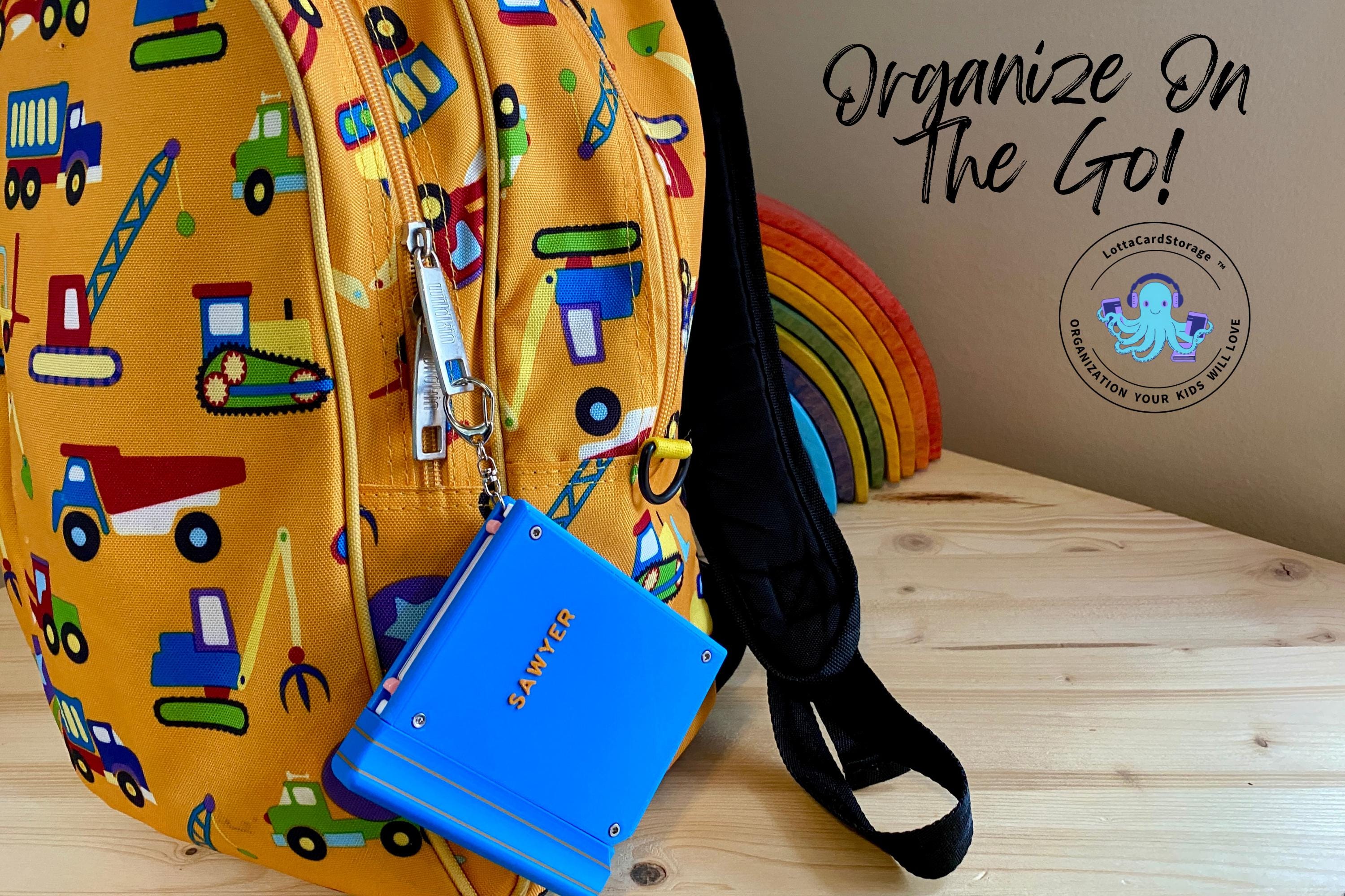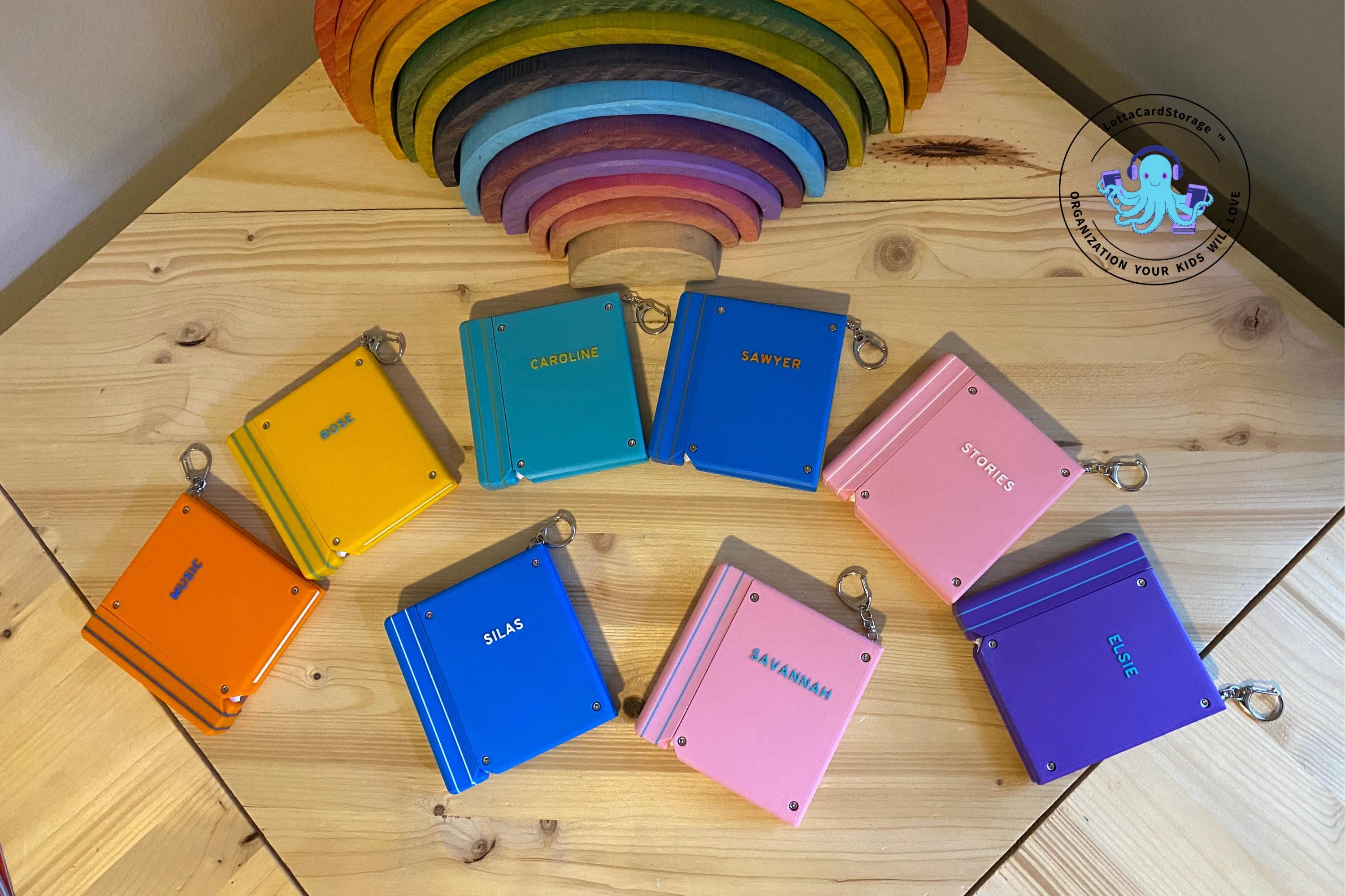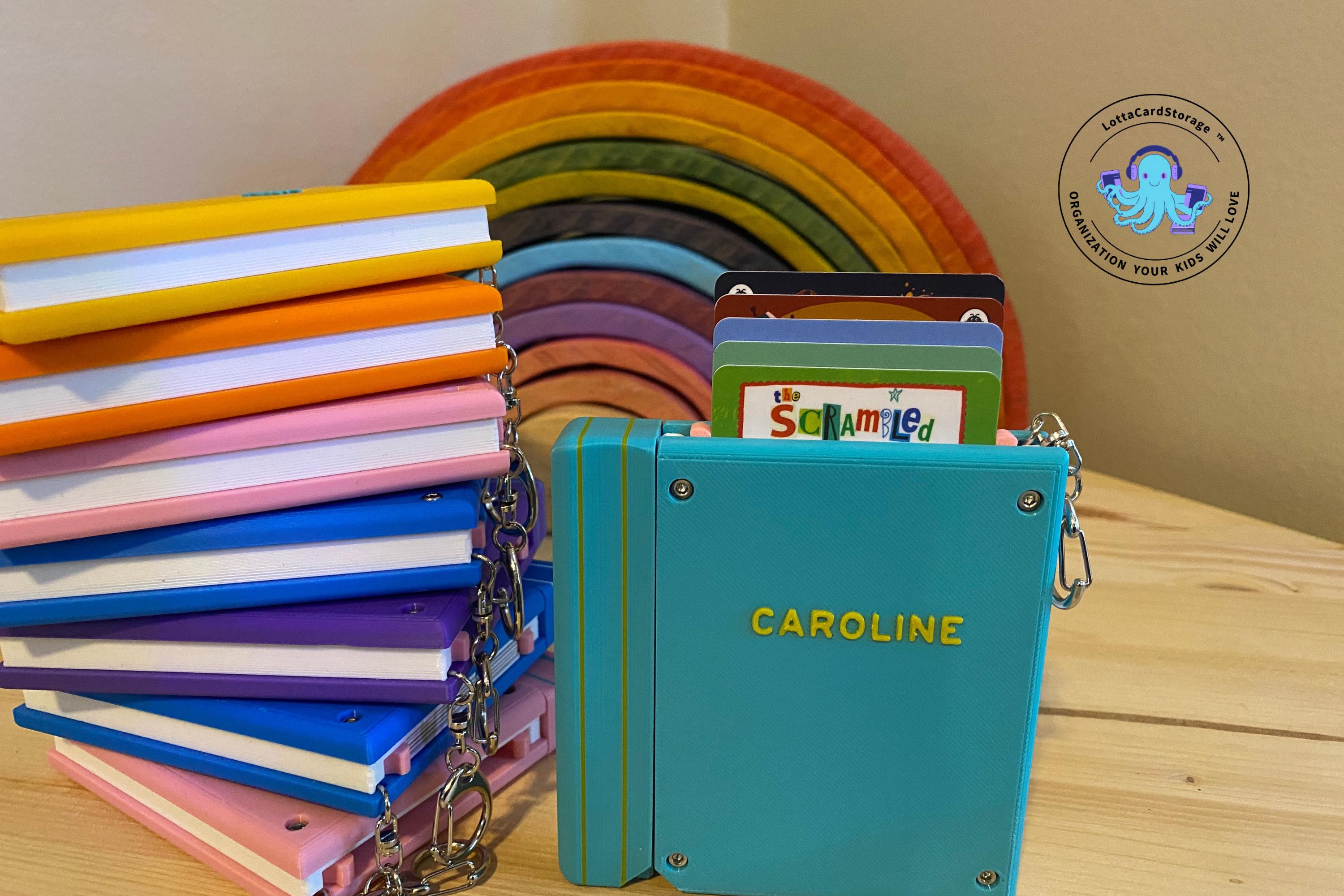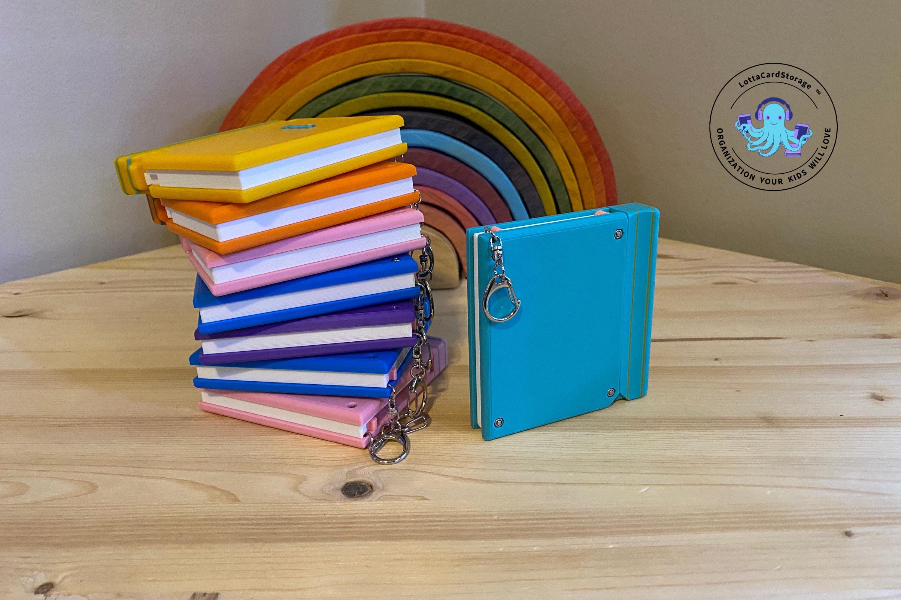 This book themed card wallet is the perfect way for your kids to take some of their Yoto card collection with them and keep them organized. The book securely clips to backpacks, Yoto mini straps, etc. with the included keyring. Your kids will love how the cards pop out of the top of the book (and so will you!). They will have fun just listening to their chosen card and using this card wallet as a fidget toy. This organizer holds 5 cards. Load them into the top and push them all the way down. Pull the top portion of the “spine” and watch the cards come out of the top in a staggered fashion.