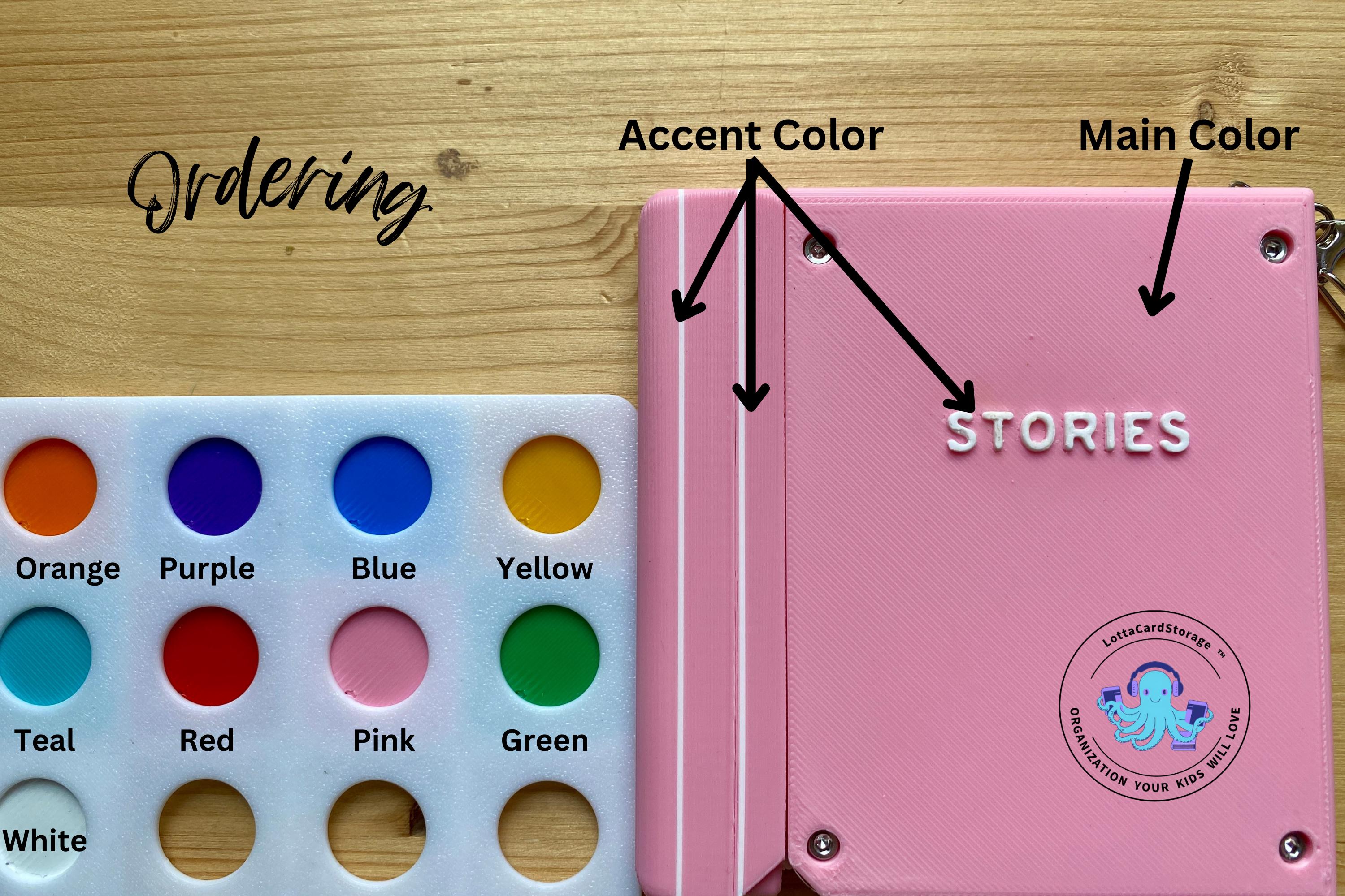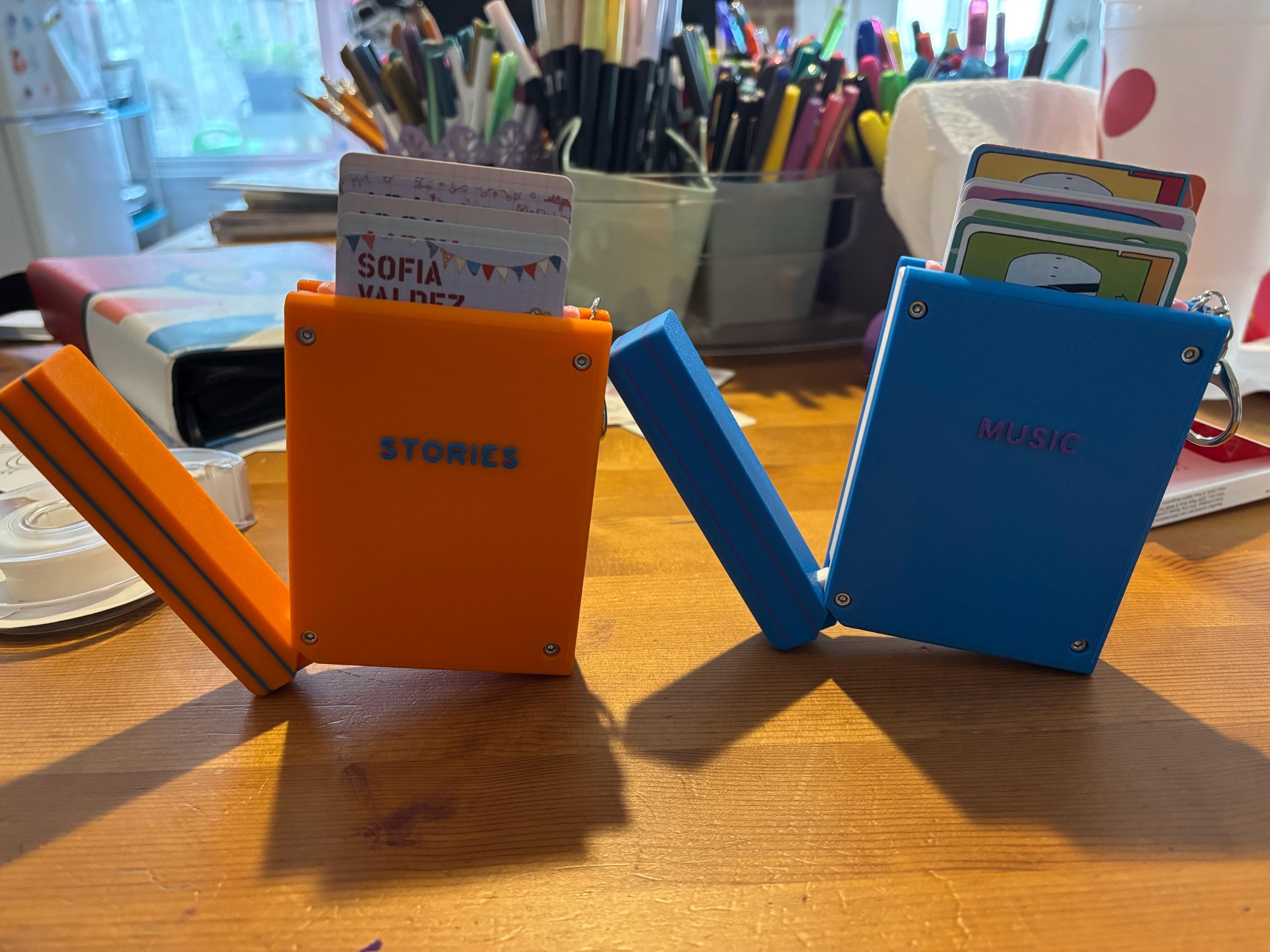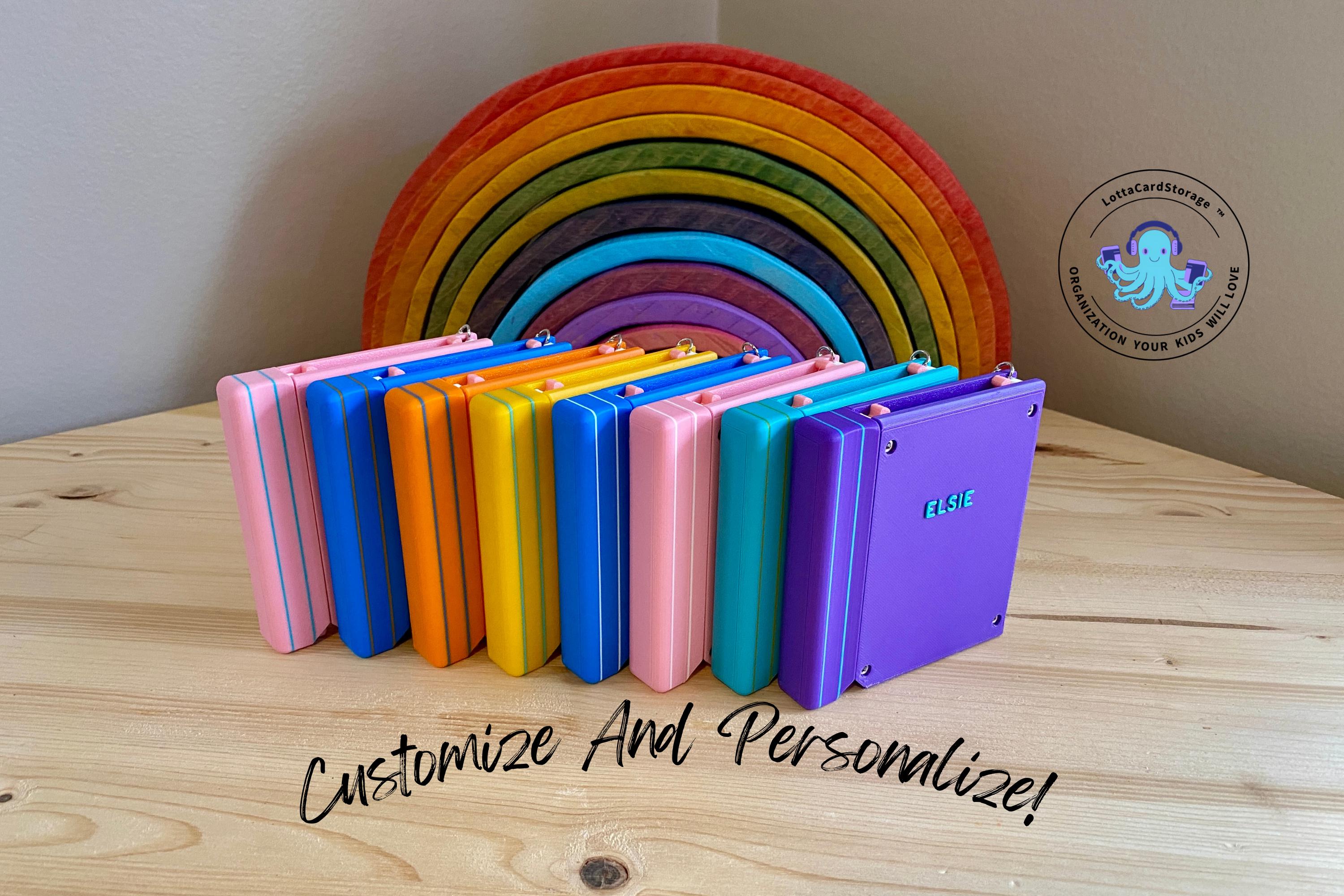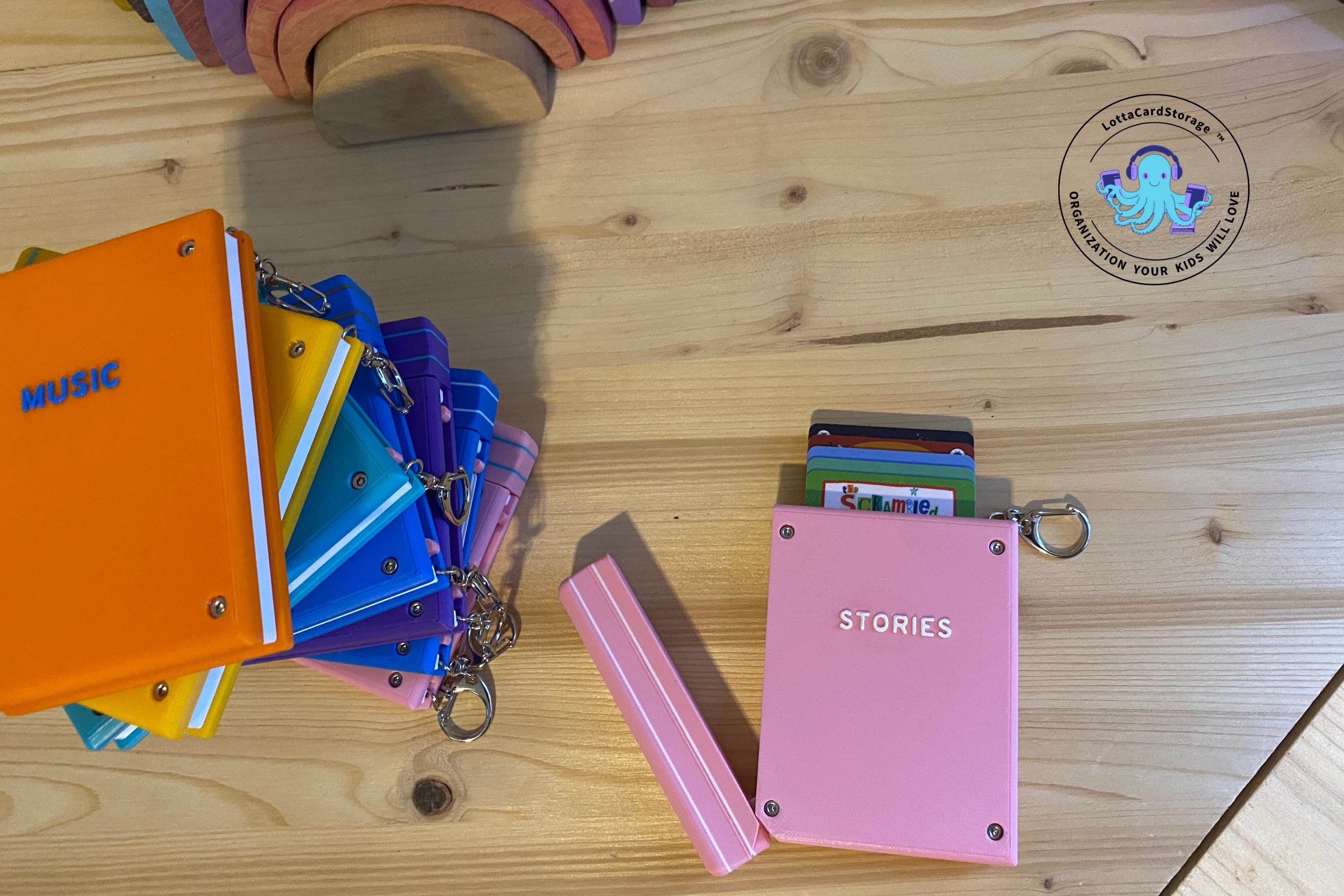 This book themed card wallet is the perfect way for your kids to take some of their Yoto card collection with them and keep them organized. The book securely clips to backpacks, Yoto mini straps, etc. with the included keyring. Your kids will love how the cards pop out of the top of the book (and so will you!). They will have fun just listening to their chosen card and using this card wallet as a fidget toy. This organizer holds 5 cards. Load them into the top and push them all the way down. Pull the top portion of the “spine” and watch the cards come out of the top in a staggered fashion.