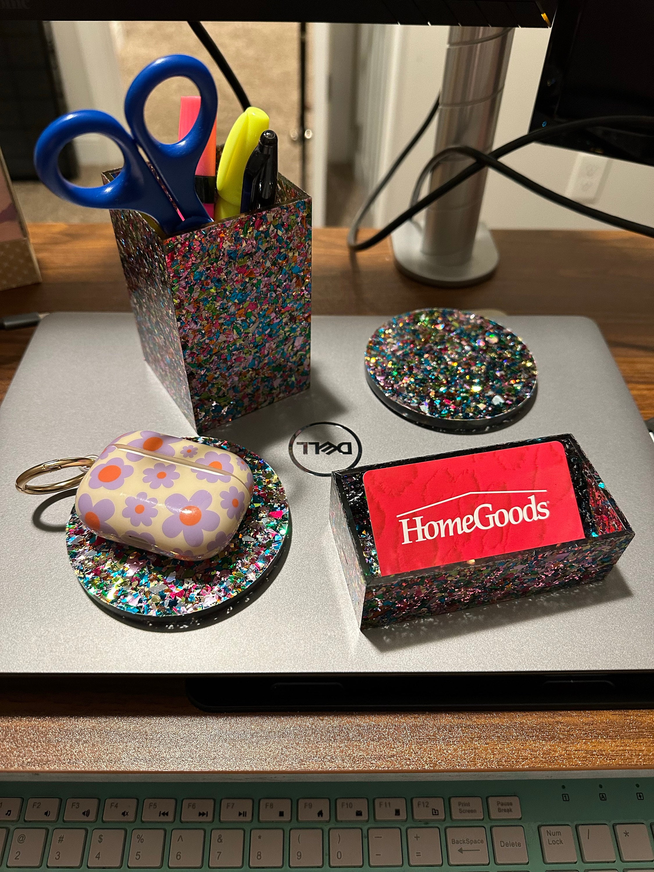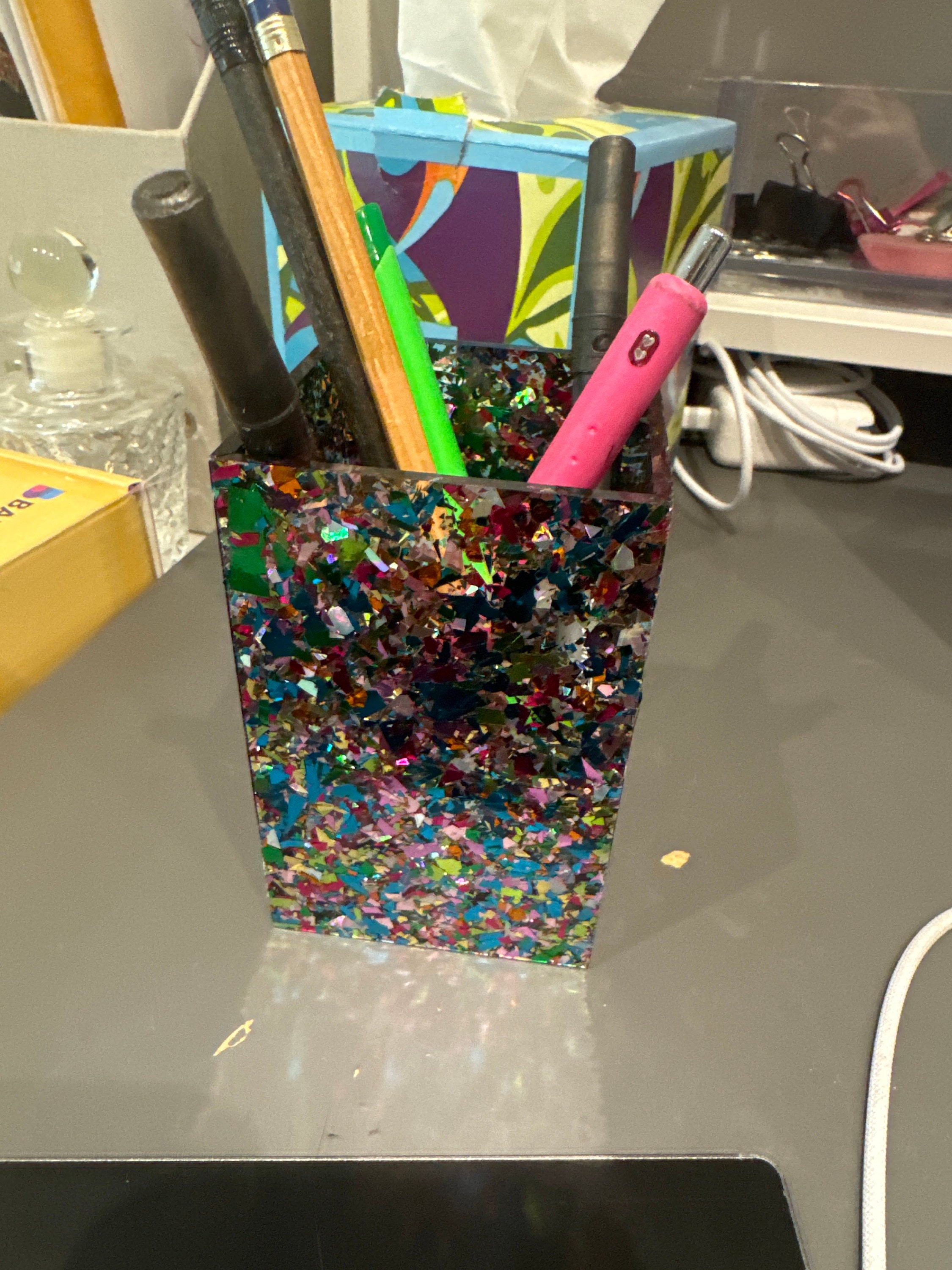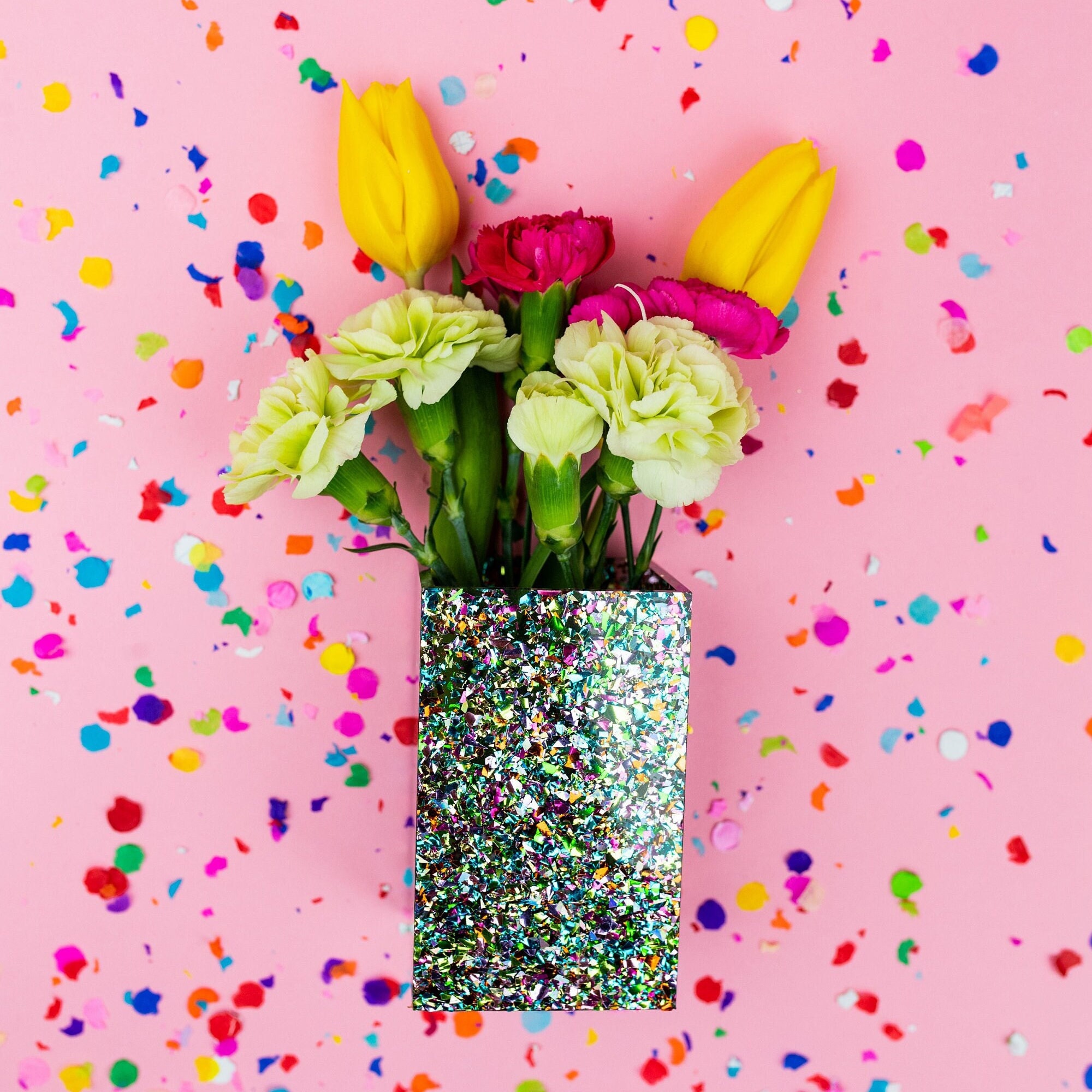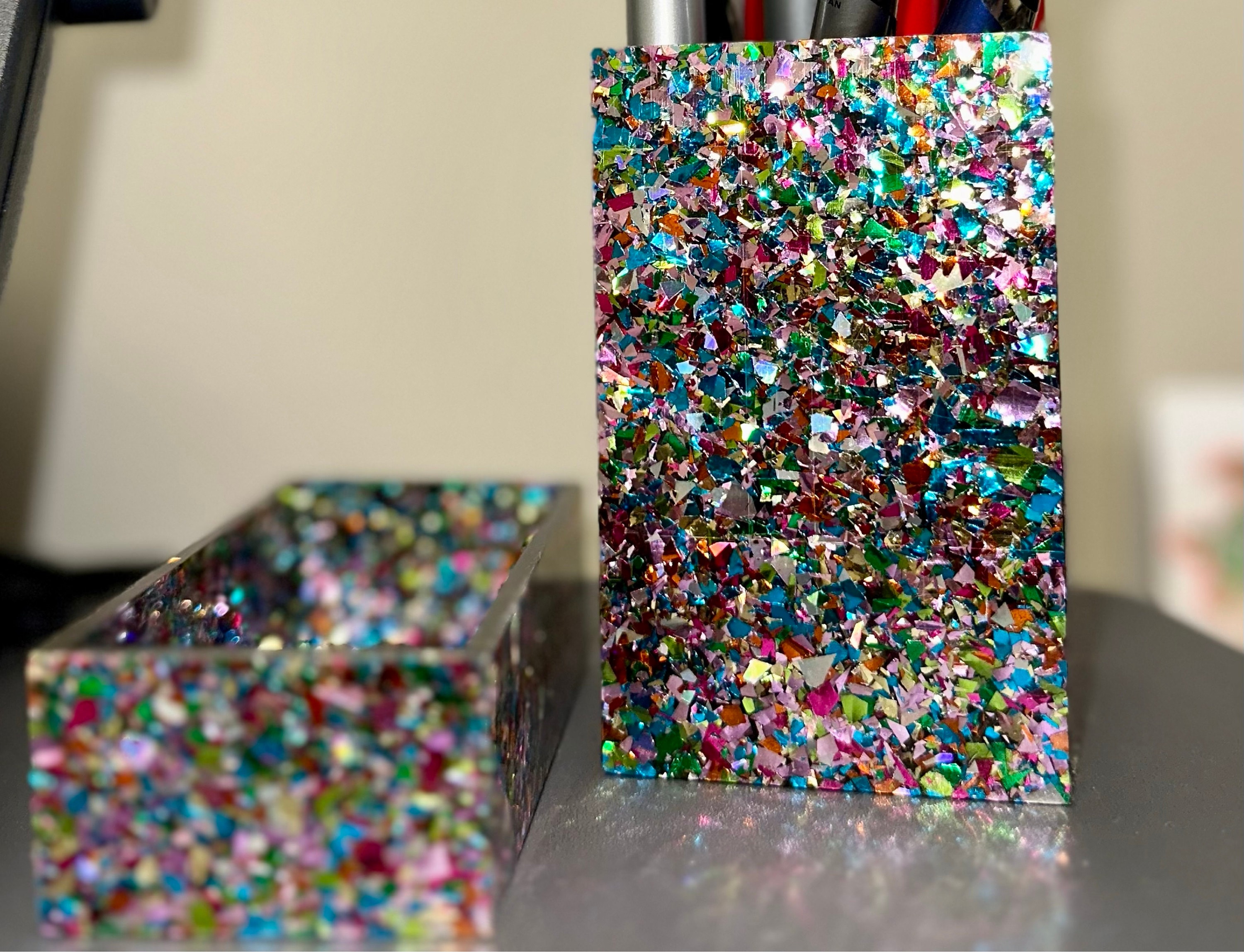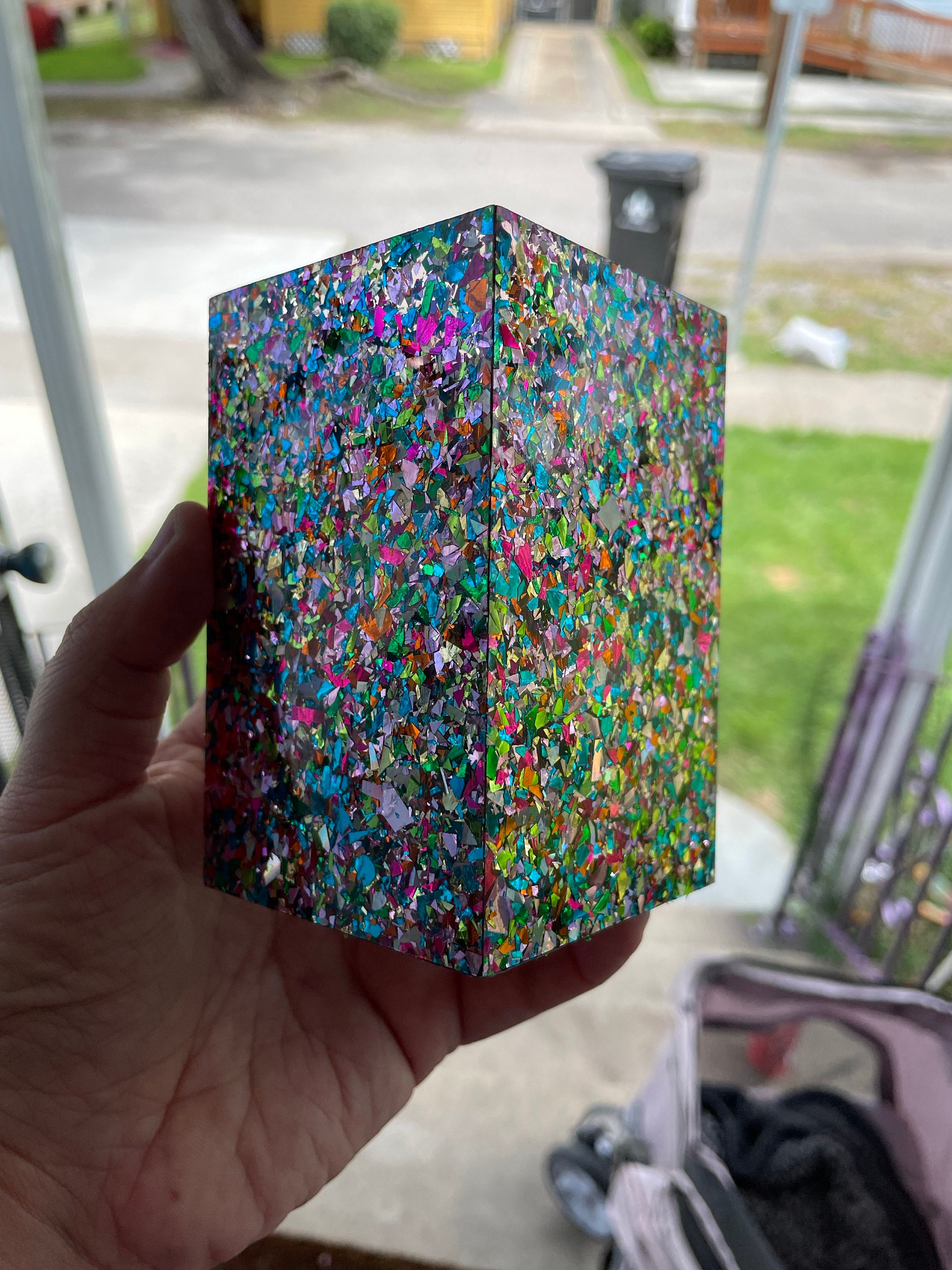This product is handmade. Confetti is hand sprinkled into the acrylic and cut and assembled by hand. Because of this unique process, no two pieces will be exactly alike.