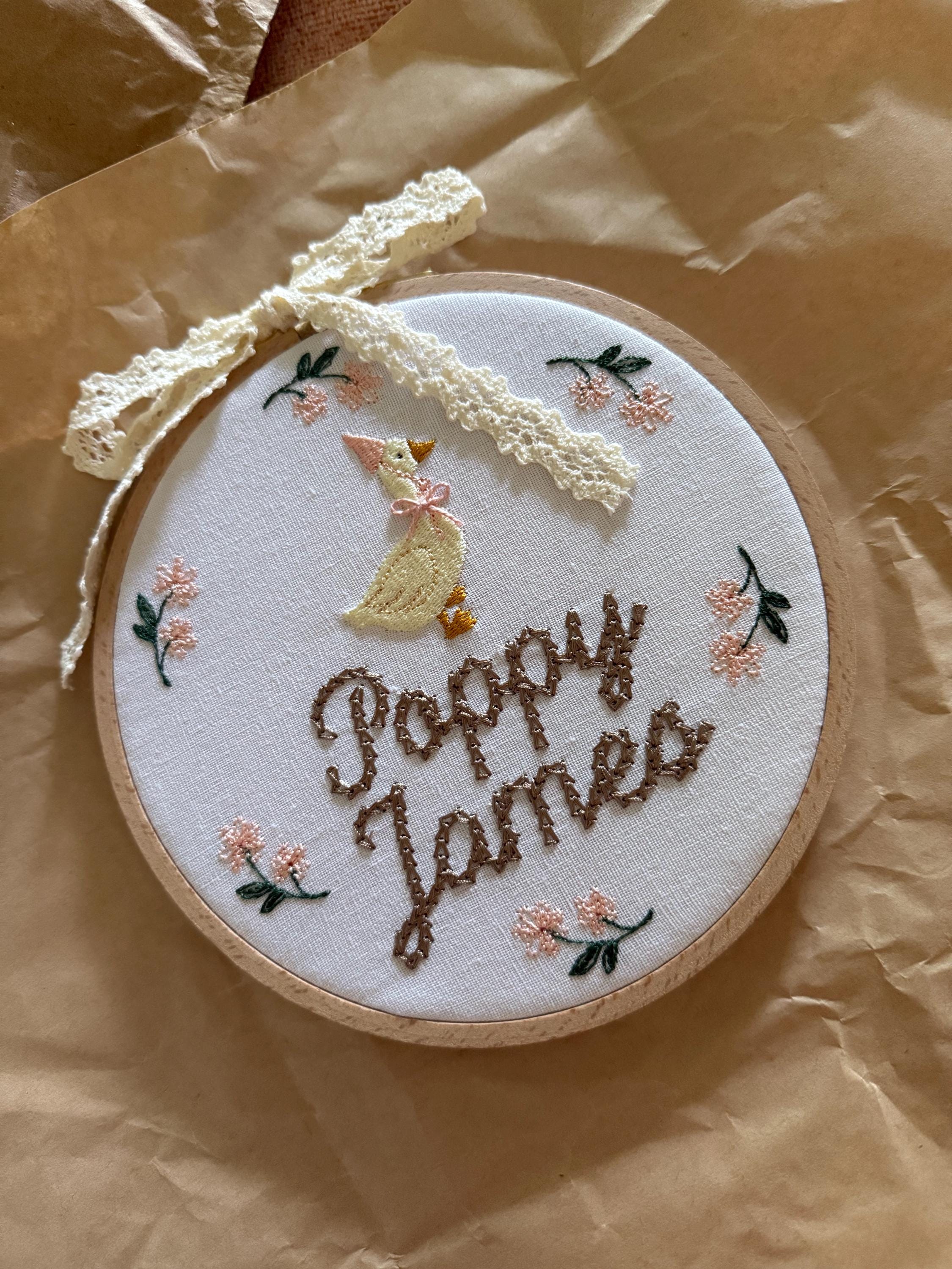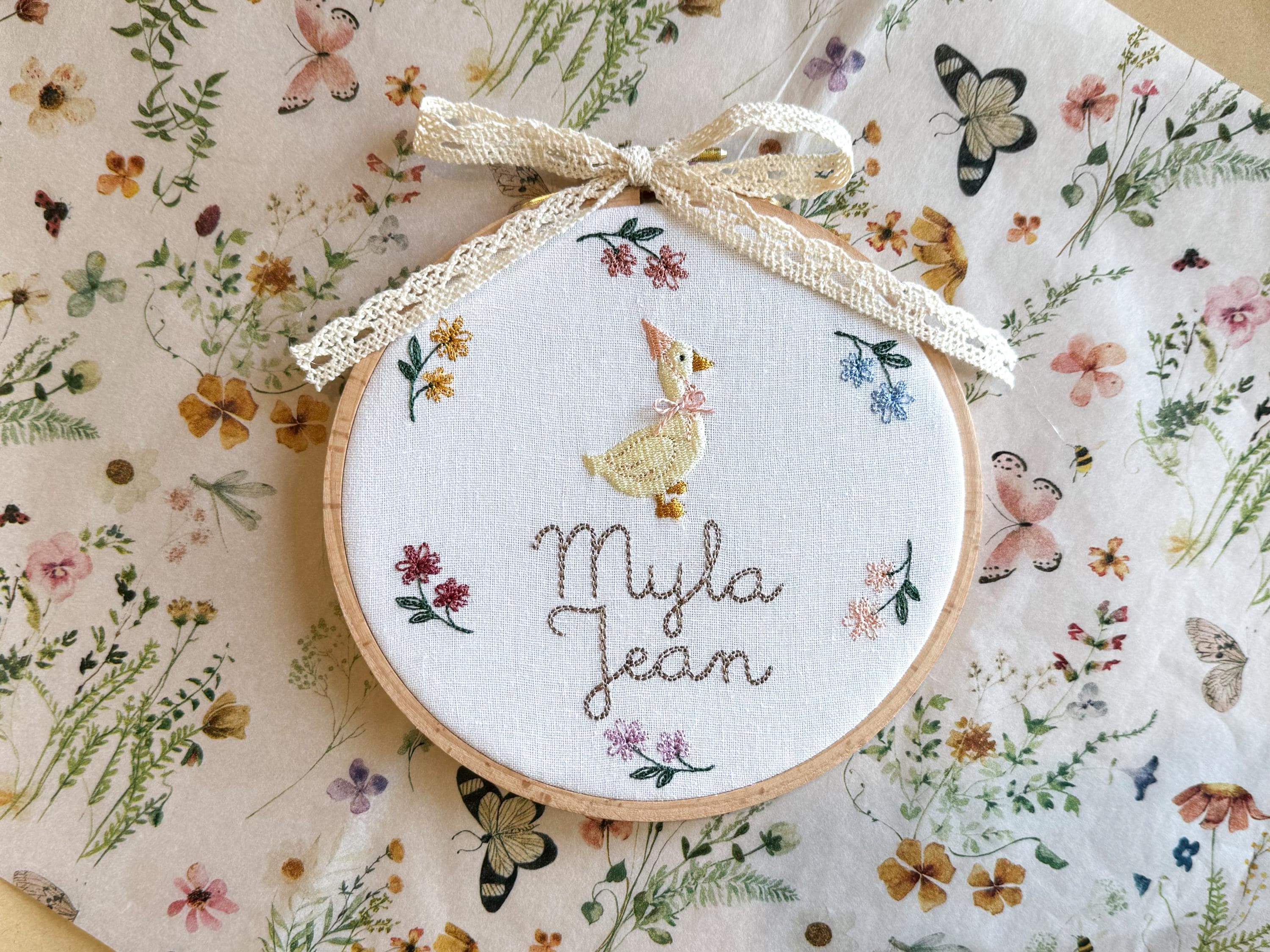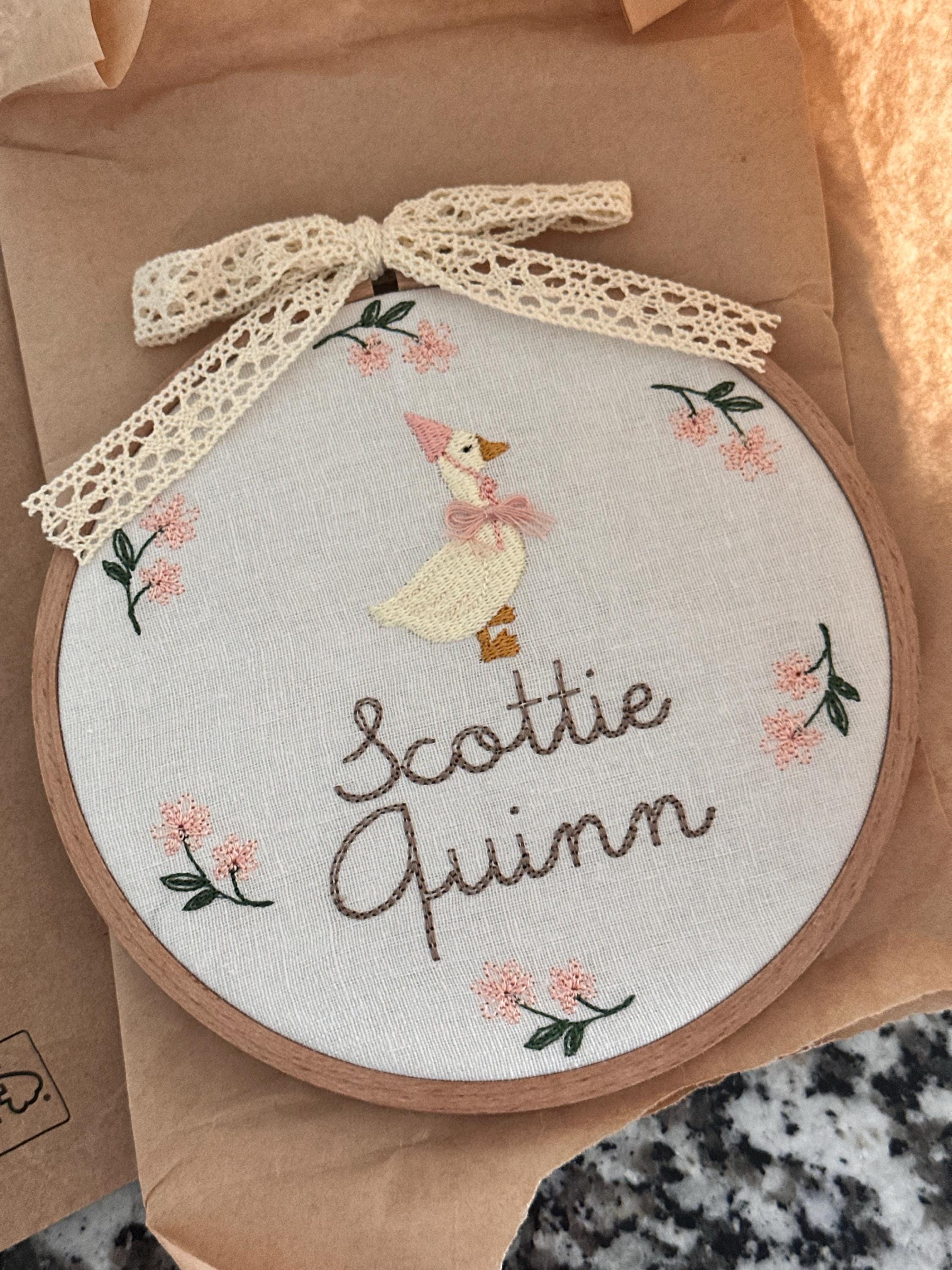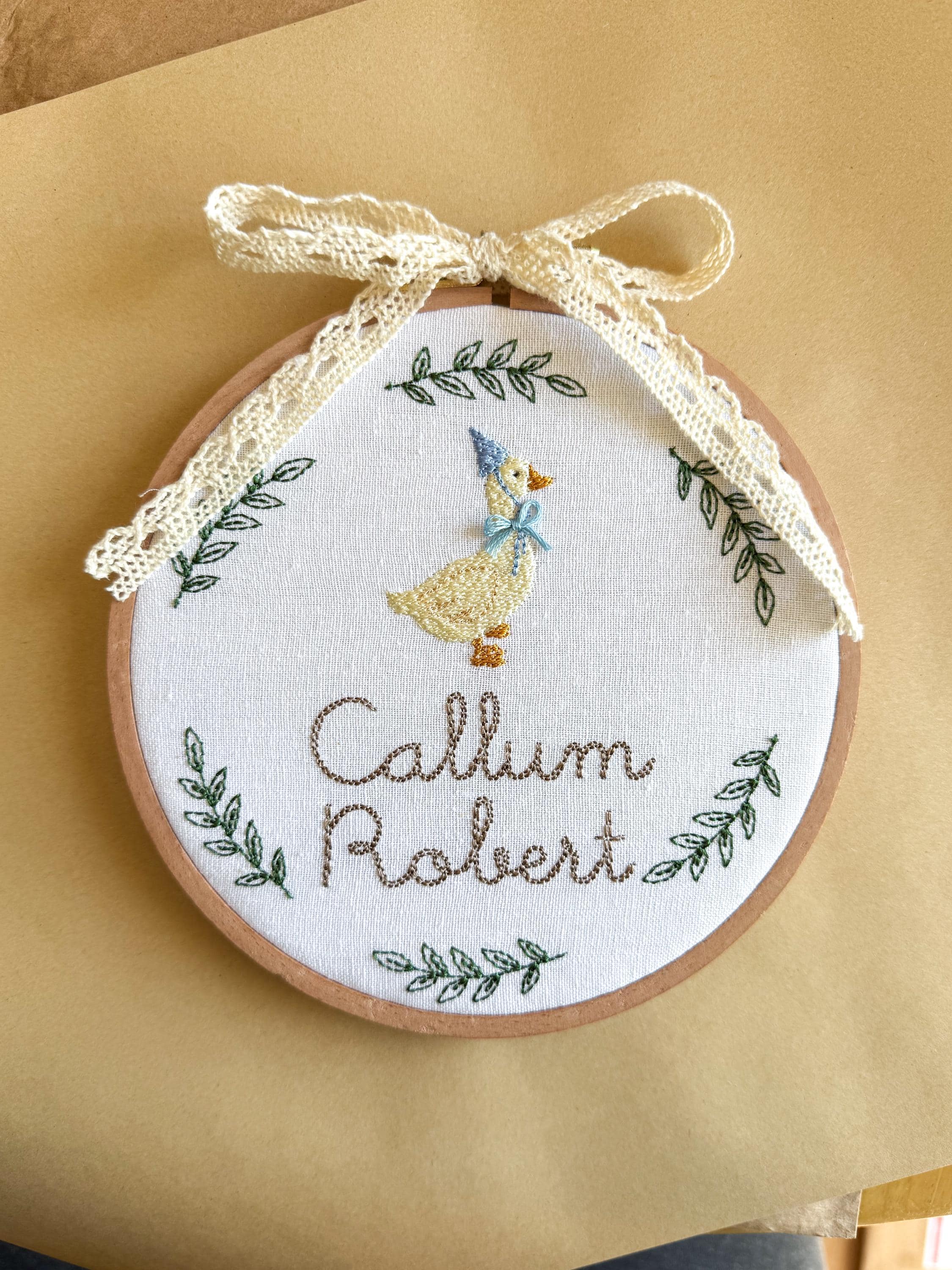 Embroidered Plaque with Baby’s Name, Nursery Rhyme Goose and a Minimalist Floral Wreath, Baby Name Announcement Sign and Nursery Wall Decor