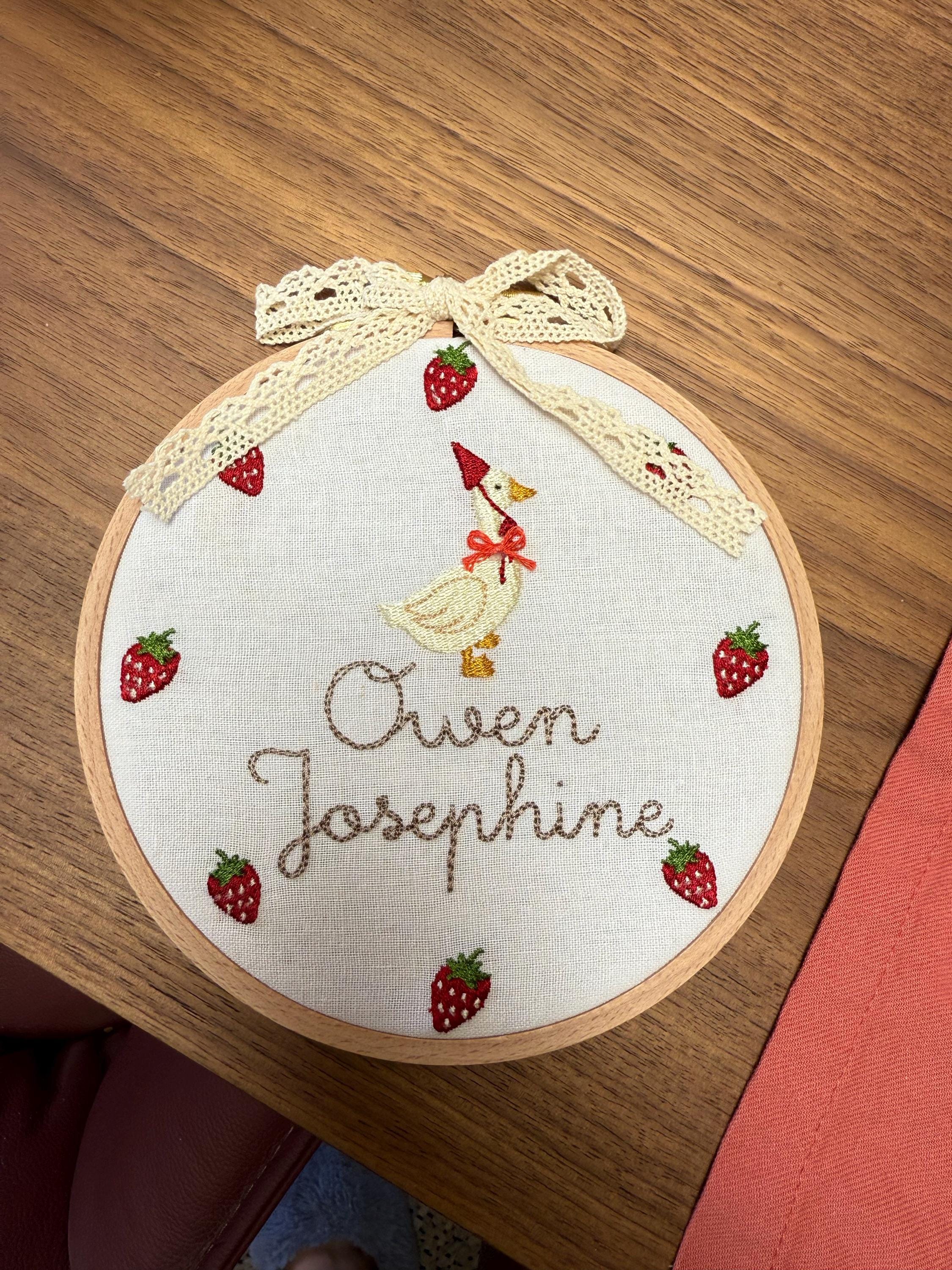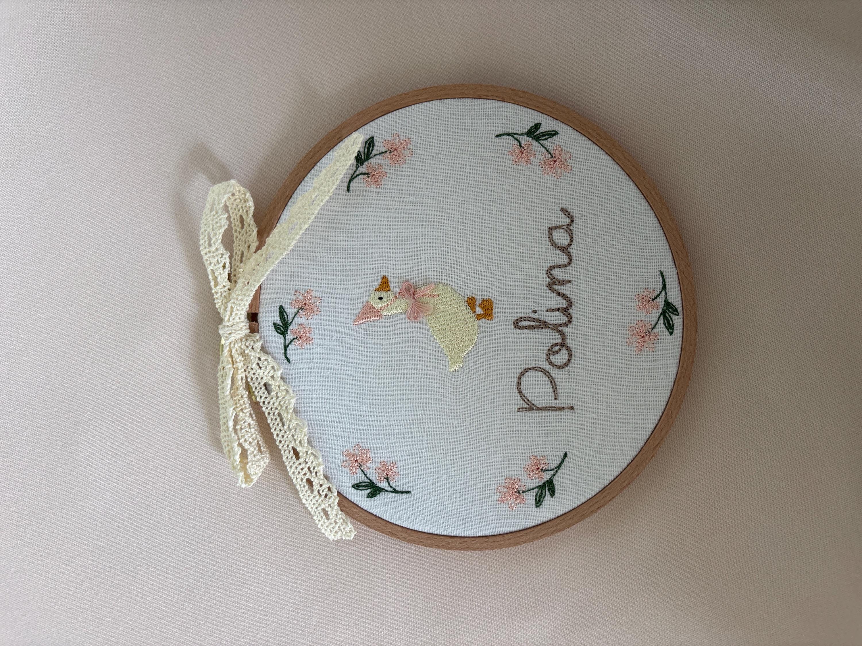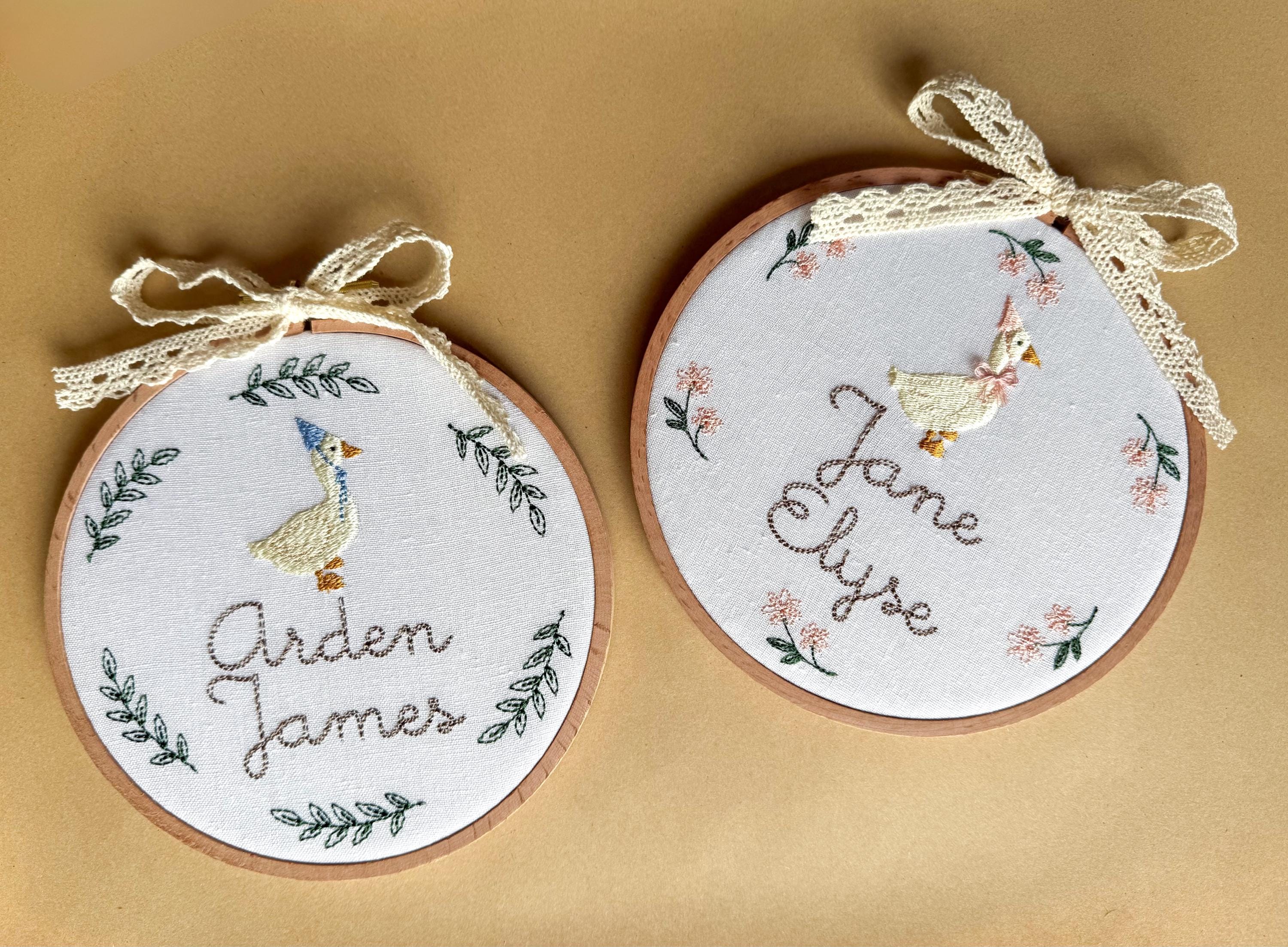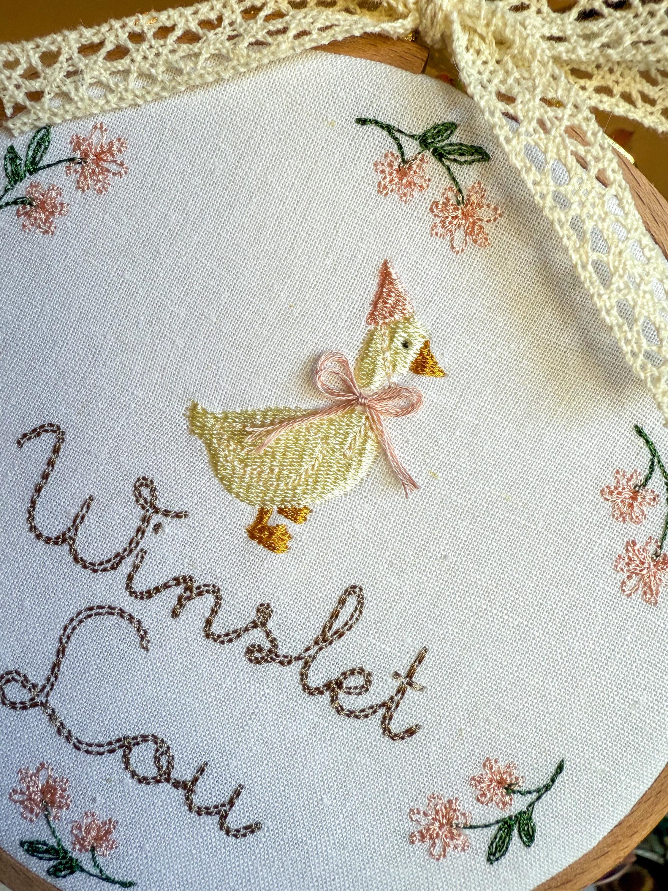 Embroidered Plaque with Baby’s Name, Nursery Rhyme Goose and a Minimalist Floral Wreath, Baby Name Announcement Sign and Nursery Wall Decor