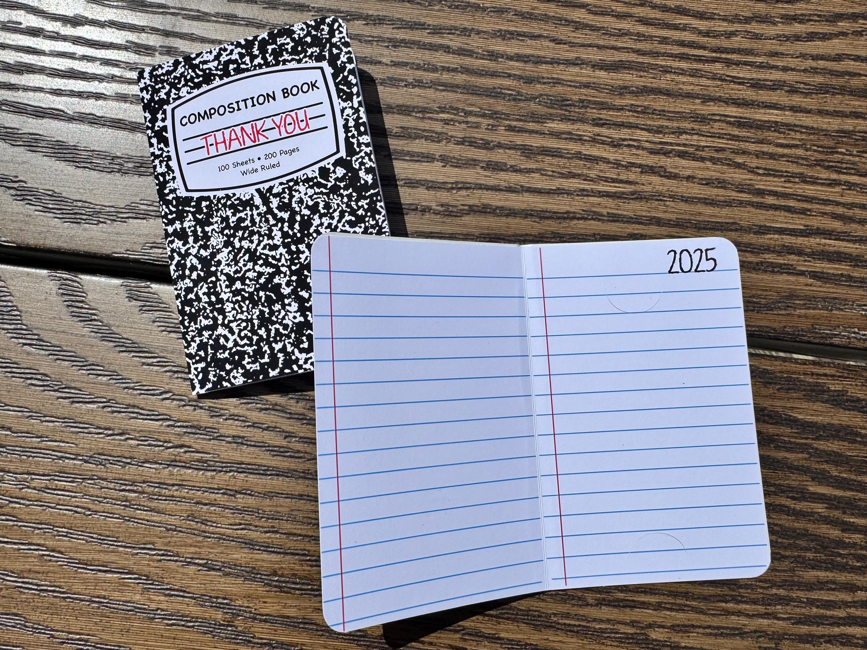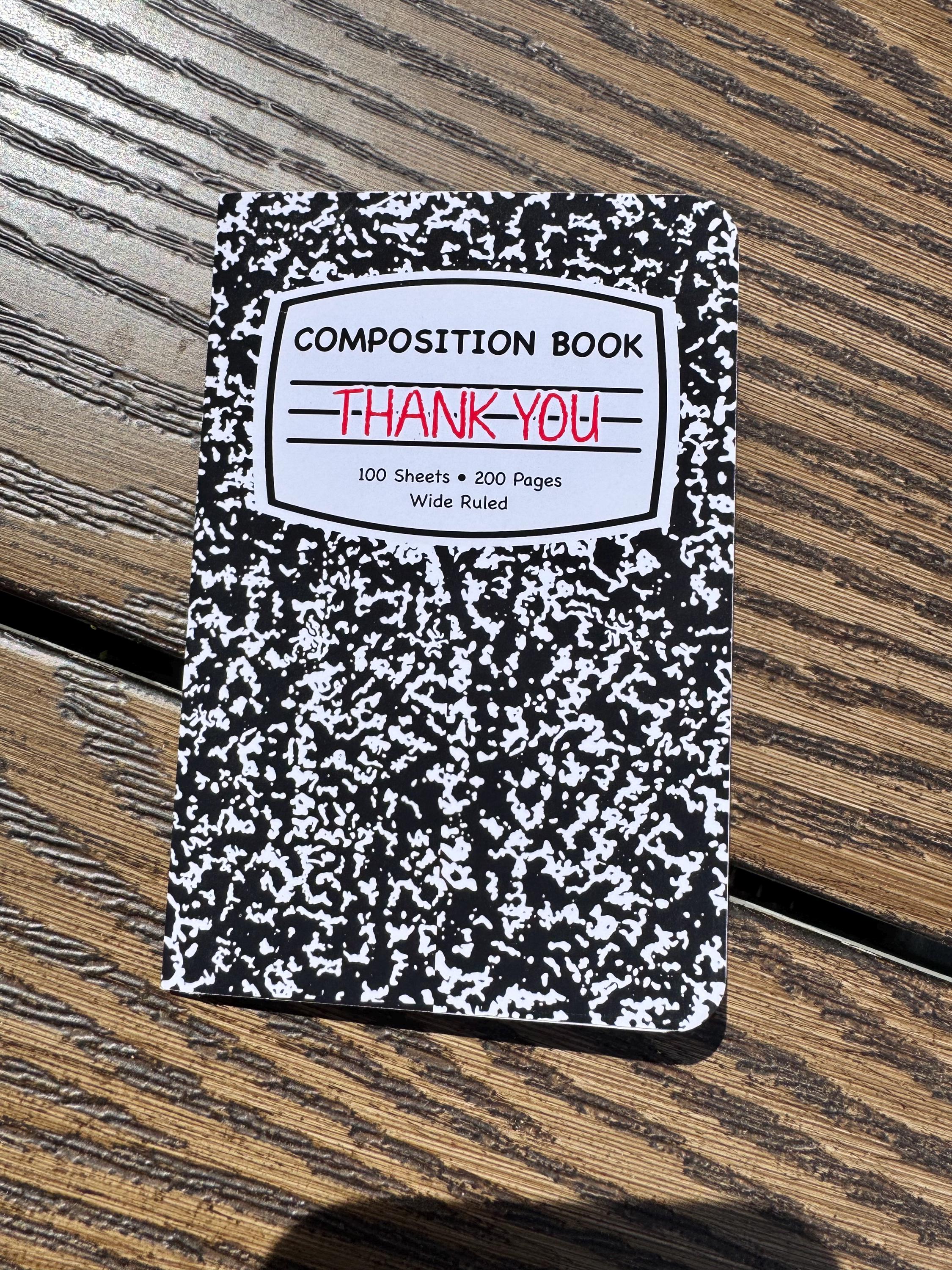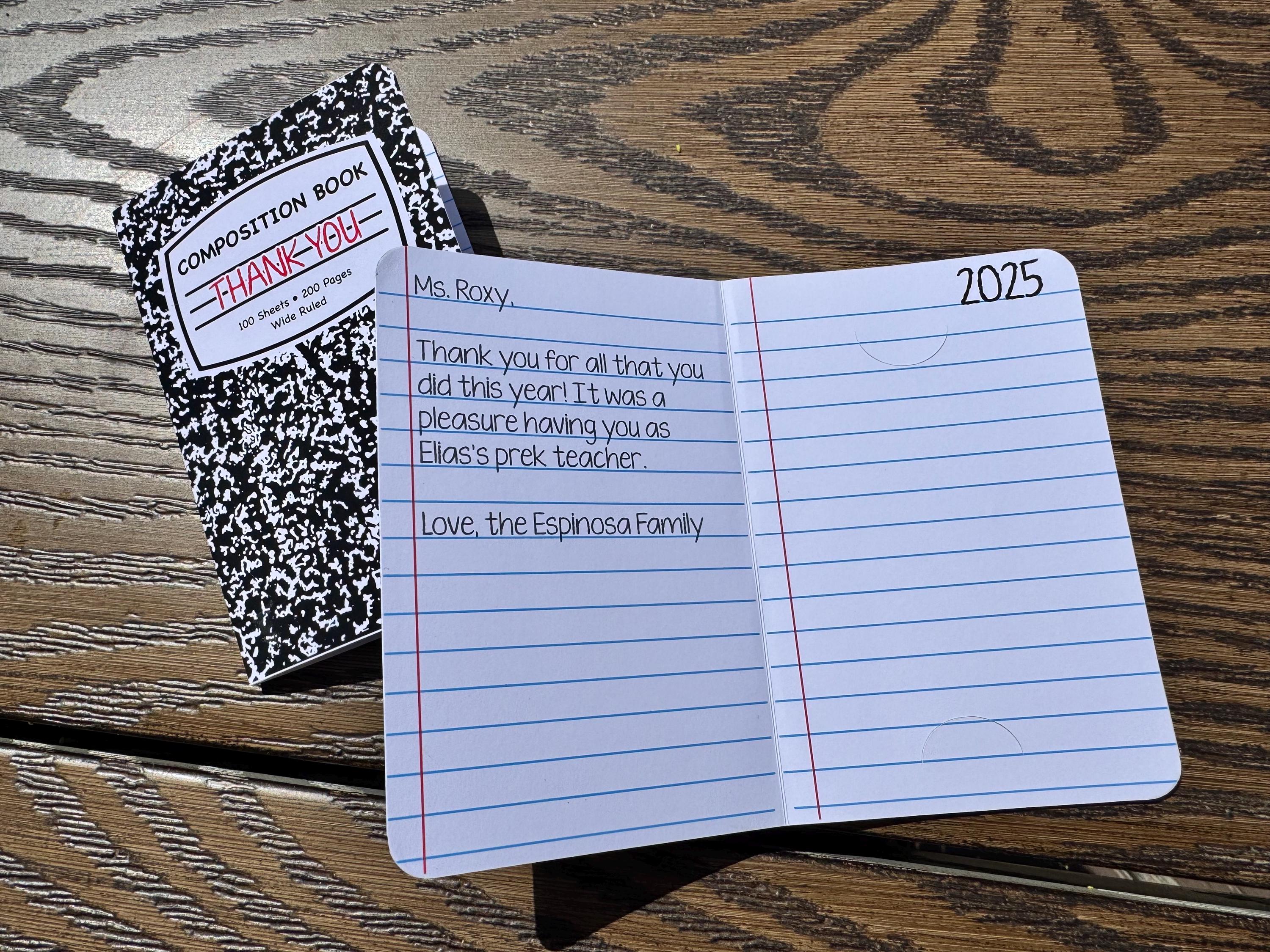 Composition notebook gift card holder that opens to reveal a personal message from your family to a teacher or other.